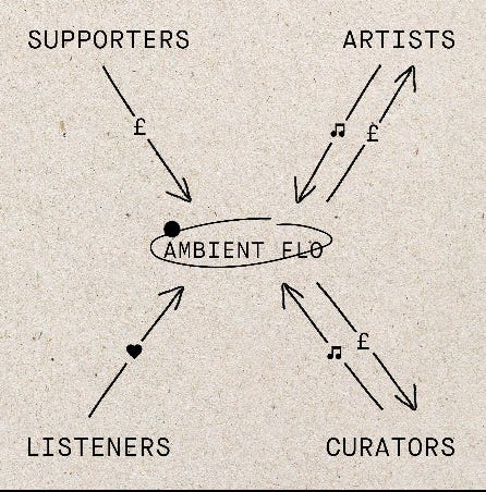 The other dimension to Ambient Flo was our attempts to build a fairer model for musicians operating in this space. At the time, fair renumeration within music was being questioned as the gig economy had evapourated overnight. Artists and small labels realised they had slept-walked into the new streaming model, where Spotify was dominant, and their ability to get fair compensation from their music being streamed was rigged in favour of the major label artists.