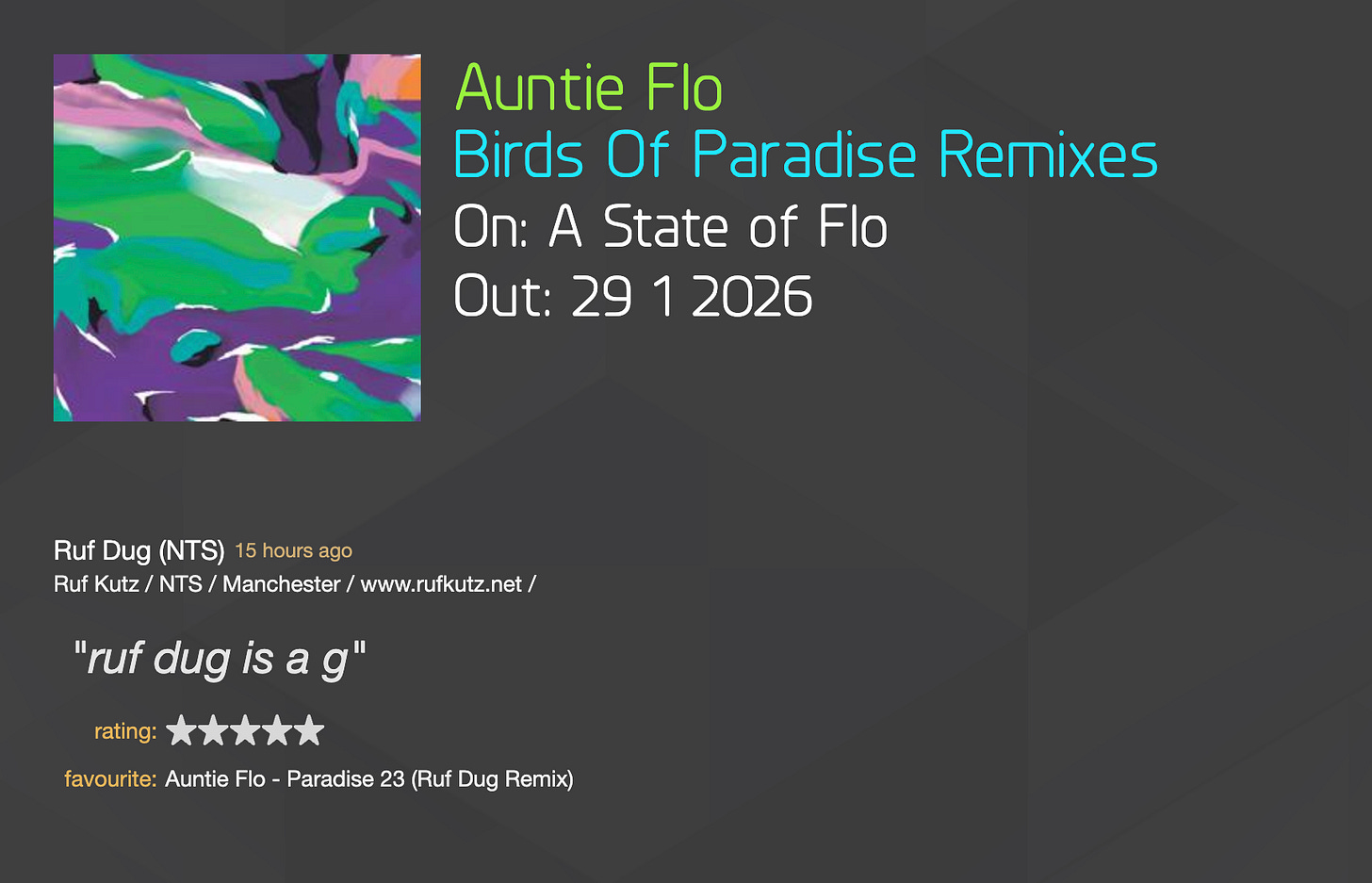 I’m generally not too fussed about remixes: I enjoy making them myself, but never felt a massive urge to hear another producers take on my work. However, as A State Of Flo is a solo operation, I thought that pulling in a few favours to get some remixes would be a good way to build bridges with adjacent producers and hopefully be a way of bringing some if their audiences into my little ecosystem. This package came together quite quickly and I’m pleased with the results. Mostly they are swaps, so look out for my remixes of Los Pulpitos and Orion Agassi…