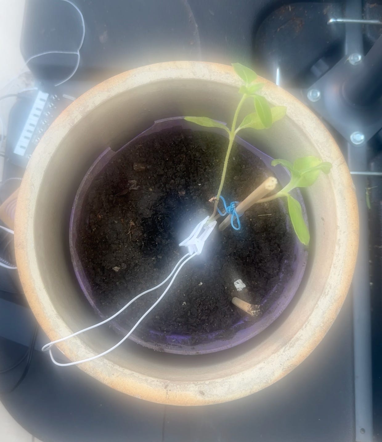 He took the plant pot home and we started to experiment with connecting it to firstly the PlantWave to hear if it made sounds.